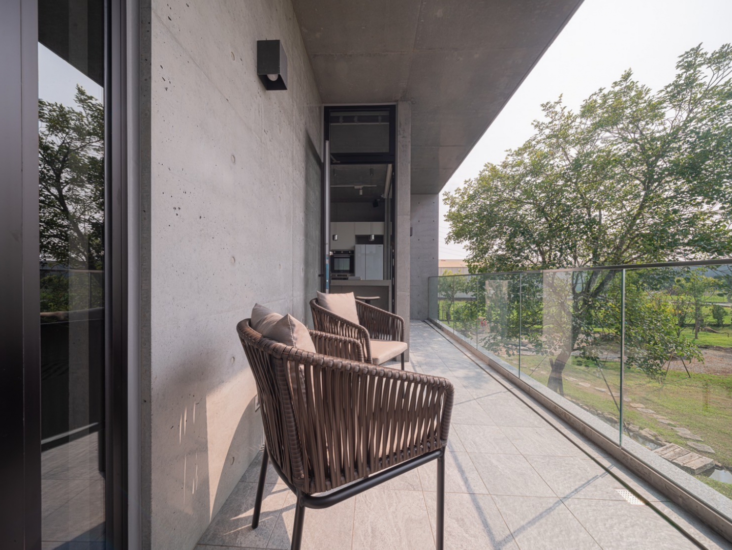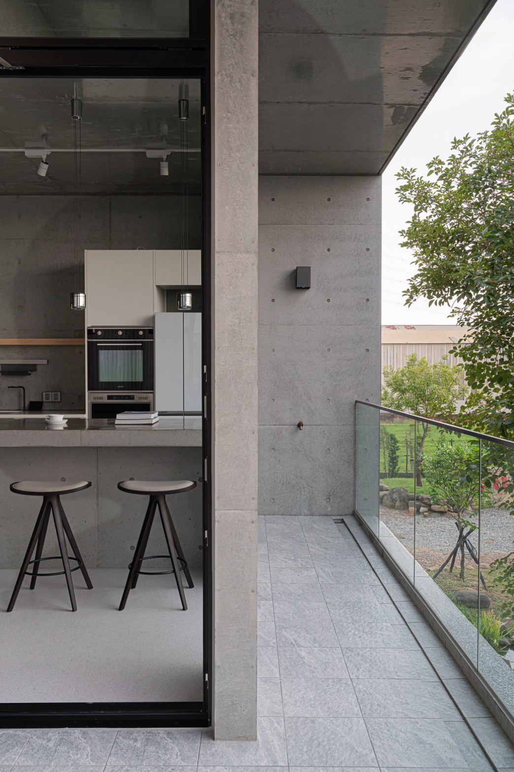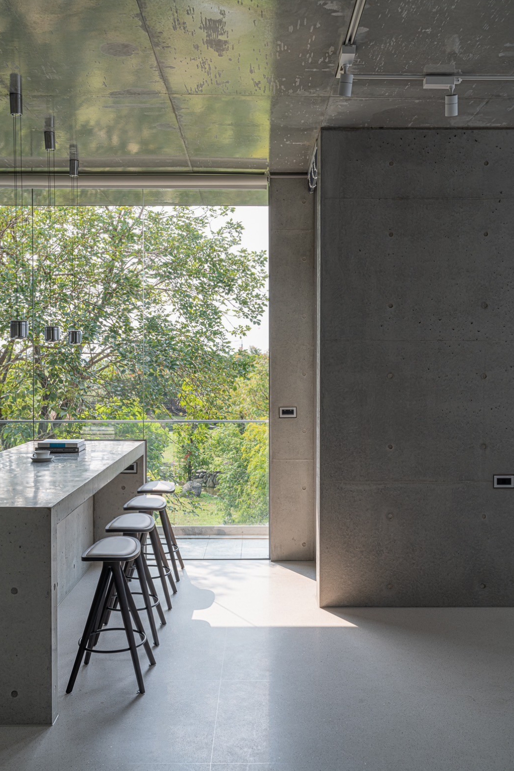 清⽔牆的洗鍊質感,透散出與⽣俱來的寧靜氣質;伴隨著光影的變化,可感受時間輕柔的流轉, 流淌入室的暖陽,帶來溫暖也撫慰了內⼼的疲憊,⼤⾯玻璃將極佳的景緻與室內融合,坐在清⽔模吧台區,凝視樹⽊隨風搖曳,肆意享受⼤⾃然所賦予的視覺饗宴,端杯咖啡走出陽台,撲⿐⽽來是空氣混合著綠植的清新氣味,視野所及皆是療癒之⾊。
