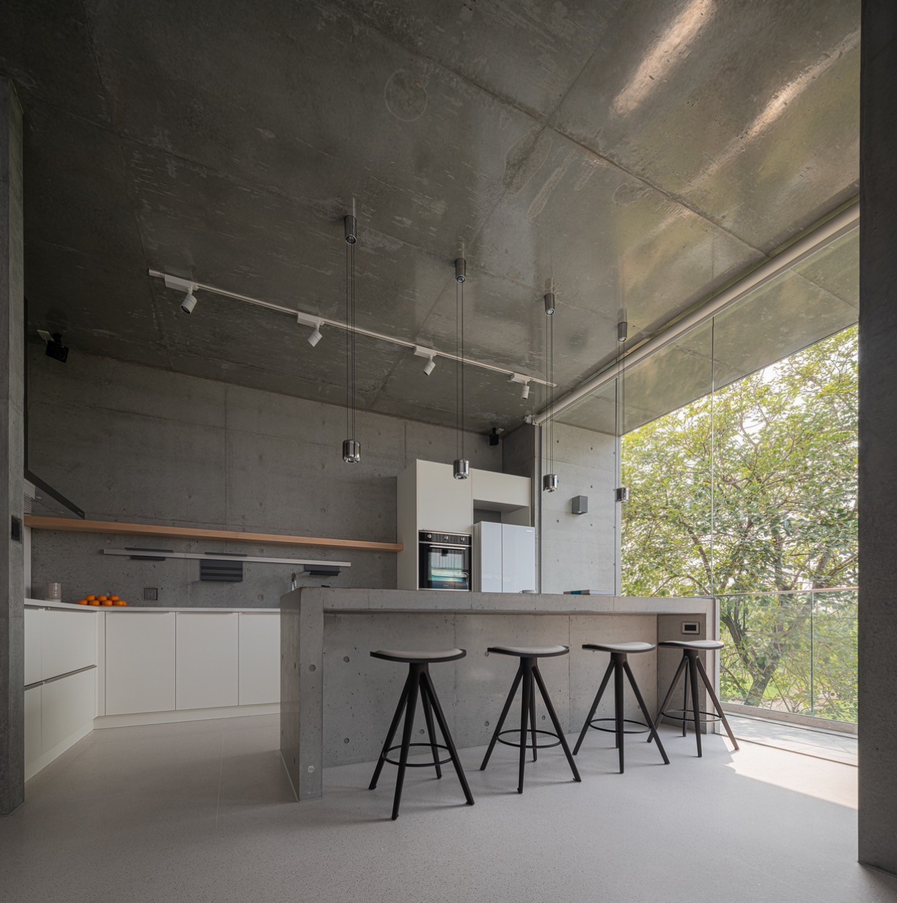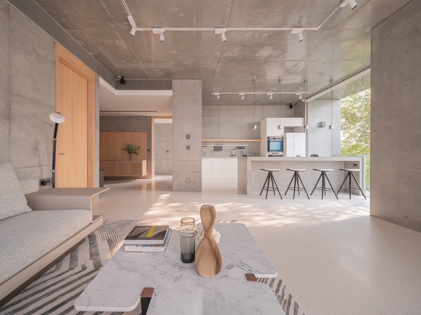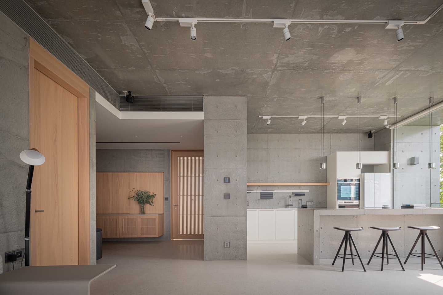 清⽔牆的洗鍊質感,透散出與⽣俱來的寧靜氣質;伴隨著光影的變化,可感受時間輕柔的流轉, 流淌入室的暖陽,帶來溫暖也撫慰了內⼼的疲憊,⼤⾯玻璃將極佳的景緻與室內融合,坐在清⽔模吧台區,凝視樹⽊隨風搖曳,肆意享受⼤⾃然所賦予的視覺饗宴,端杯咖啡走出陽台,撲⿐⽽來是空氣混合著綠植的清新氣味,視野所及皆是療癒之⾊。