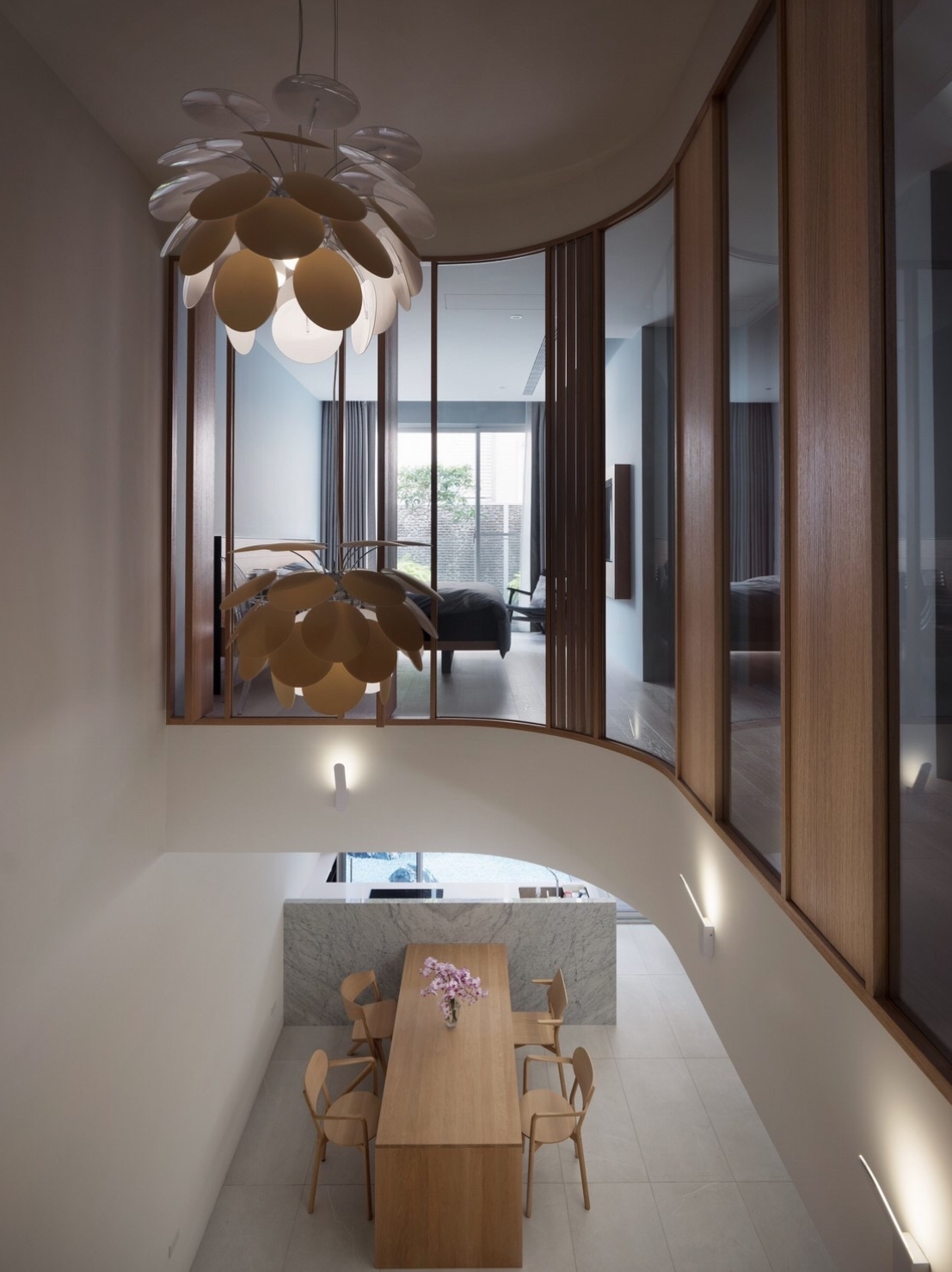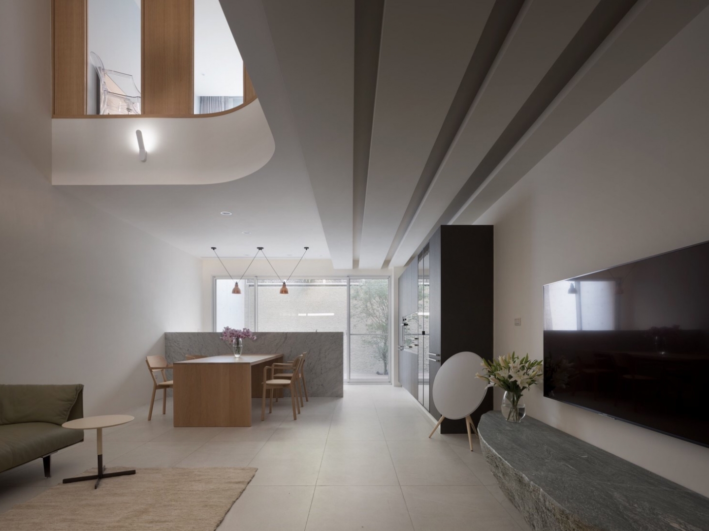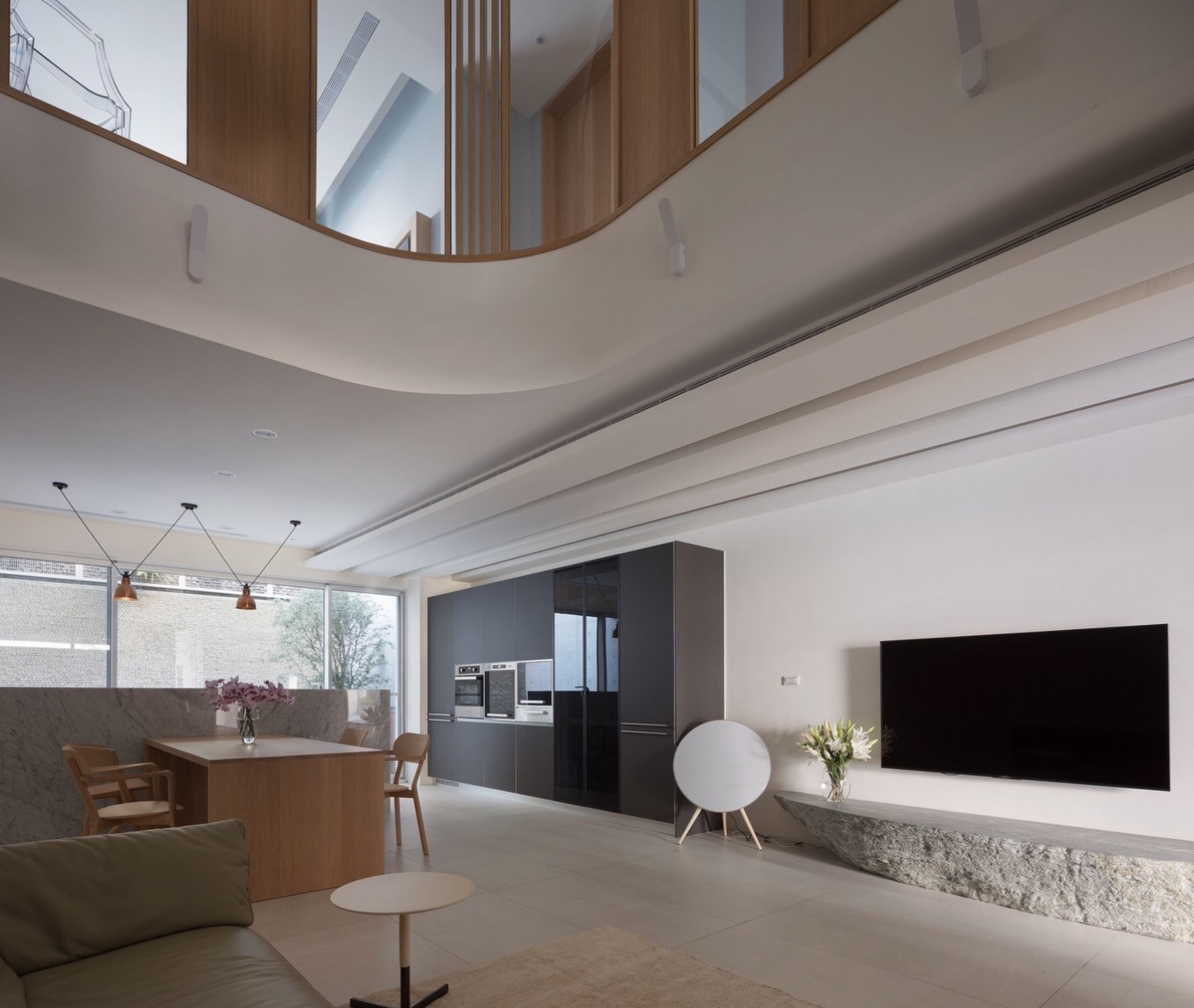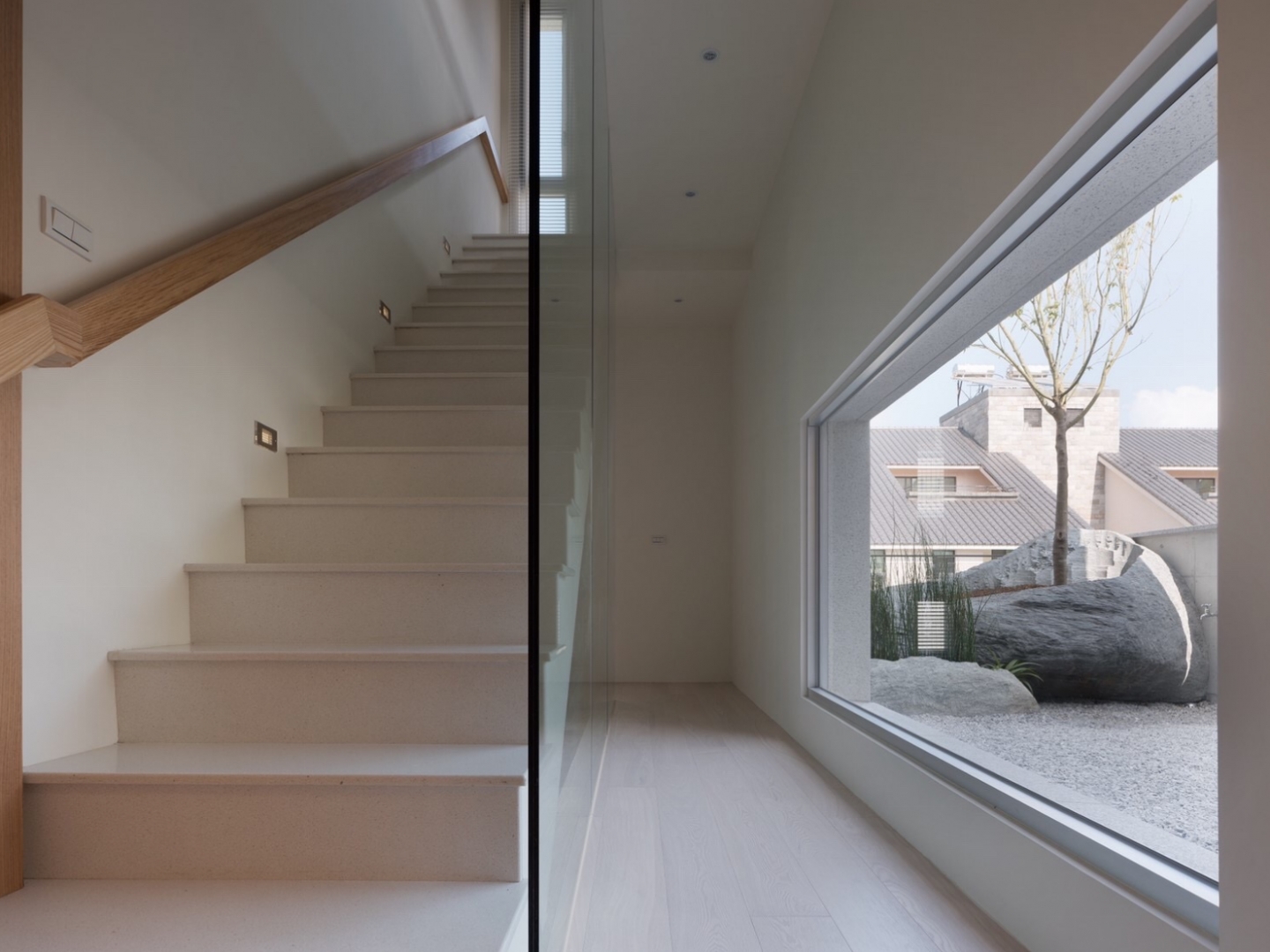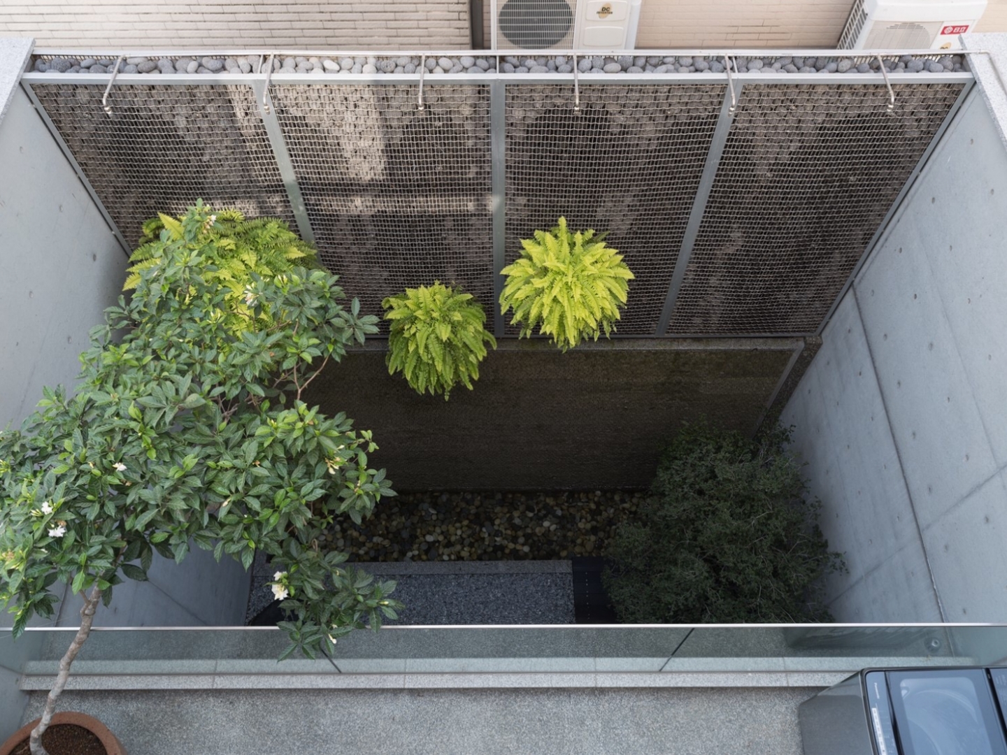 這是一位單身男子的住宅,從買地到建屋逐漸堆疊出他夢想中的家,簡單的設計、簡單的生活,是他對此住宅的要求,因此在空間的設計上採取垂直高度的拉伸及水平方向的穿透來拉寬視野,並運用植物的綠意及水流聲,呈現輕鬆的氛圍,用卵石及鐵網作為阻隔鄰房的圍牆,不僅自然通風良好亦可保有隱私,更是植物最佳的背景,自然的光線引進室內,產生不同光影,讓空間更具情境。