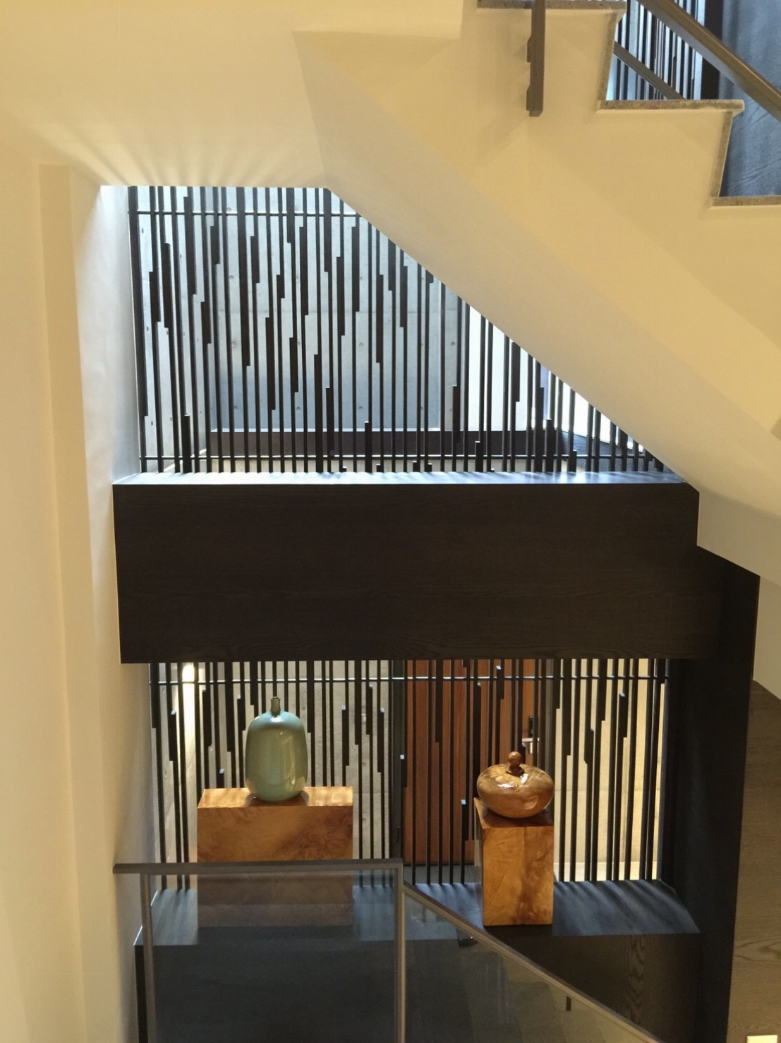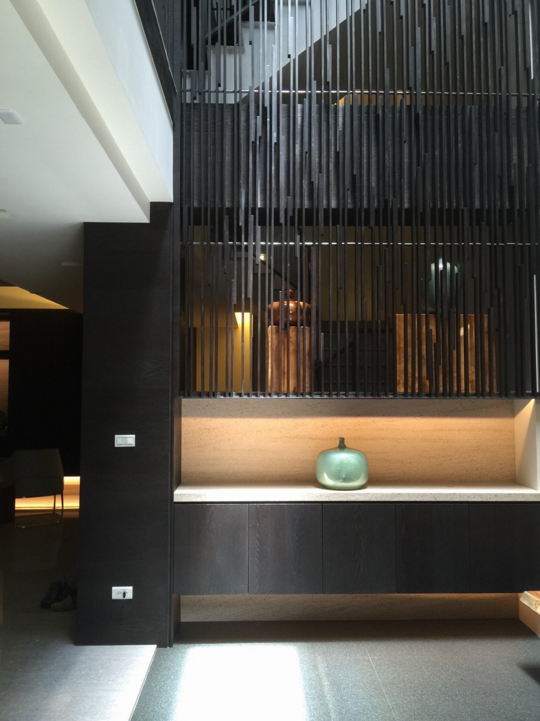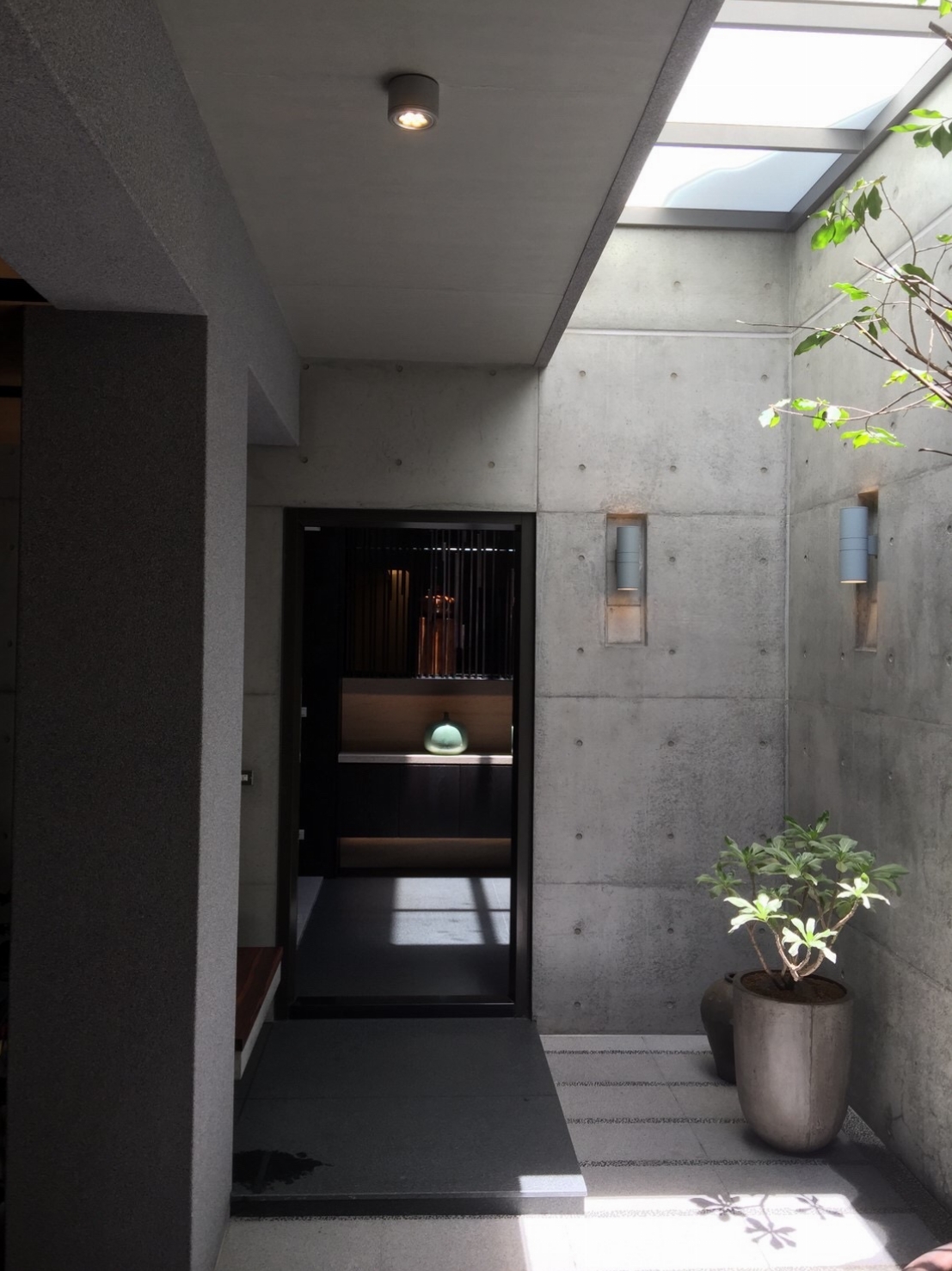 進門垂直延伸至二樓的實木隔柵交錯出虛實的意象,也讓行進樓梯間時多了些光線投影之美,清水模和抿石子讓玄關入口顯露出素雅內斂的氣質感。清水模搭配實木桌椅和木紋石材,呈現高雅脫俗,讓初次來訪的賓客感受到溫暖的氛圍。