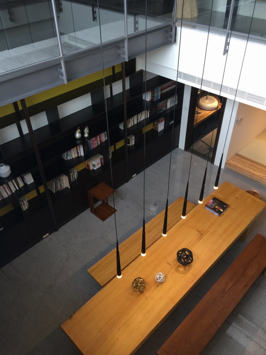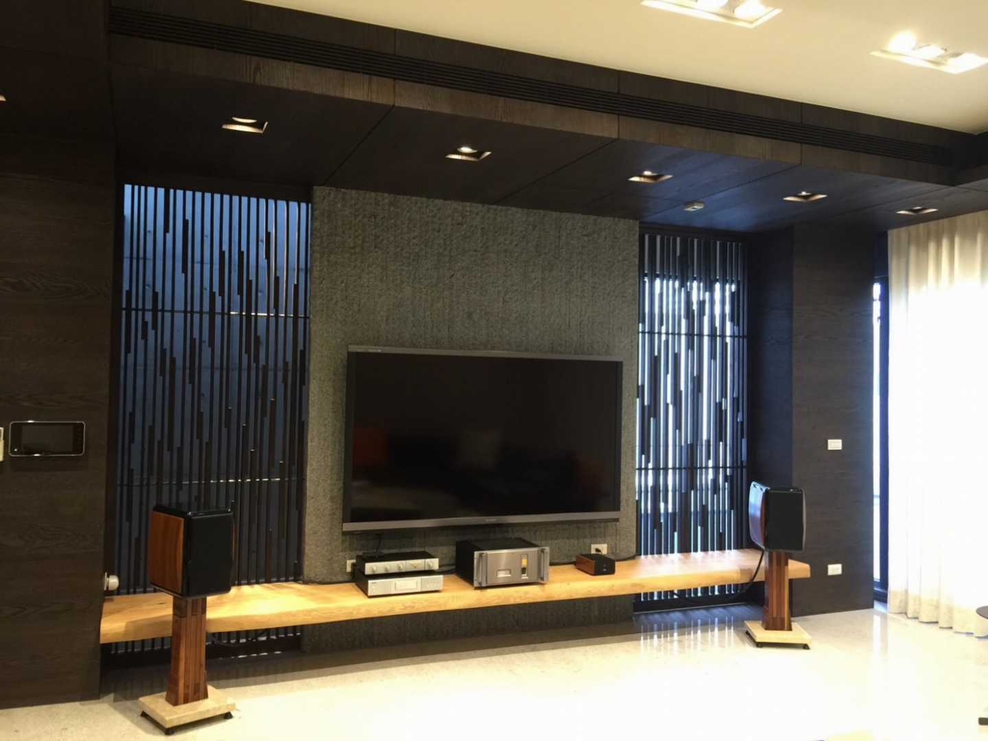 5F挑高的開放空間,貫穿二層樓的書櫃和實木桌是全家人的最愛,緊連的和室可喝茶及靜坐,亦可拉上門成為客房,另一端則是音響室,共同觀賞影片音樂,成為大家最喜歡的消遣,家人的情誼也隨著相聚的時間逐漸升溫。