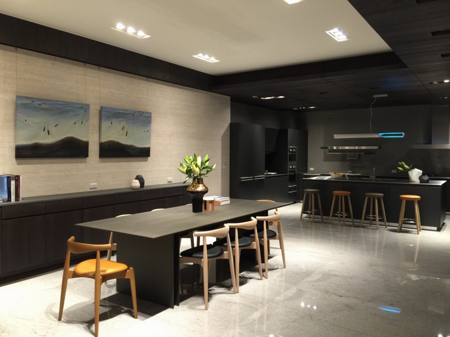 2F客廳、餐廳、廚房連貫,捨棄多餘的隔間讓視野寛廣,將室外的綠意景觀納入眼簾,呈現出俐落簡潔及細緻高雅的質量,也透露著主人的獨特品味。