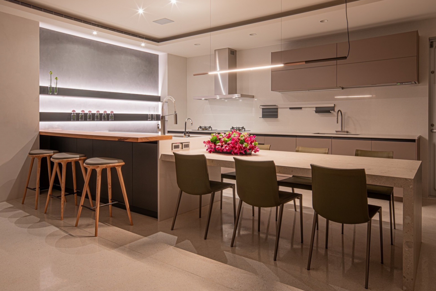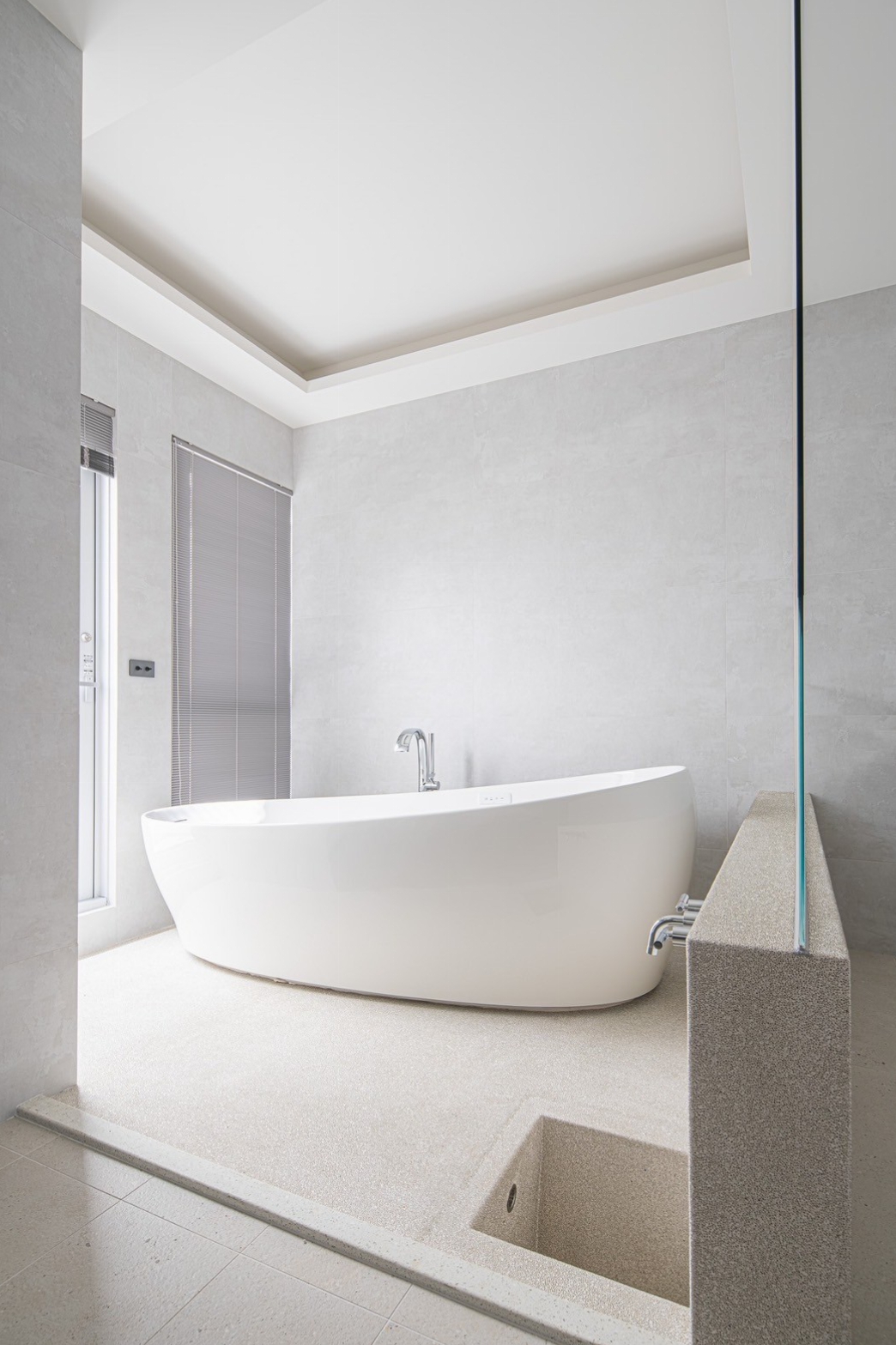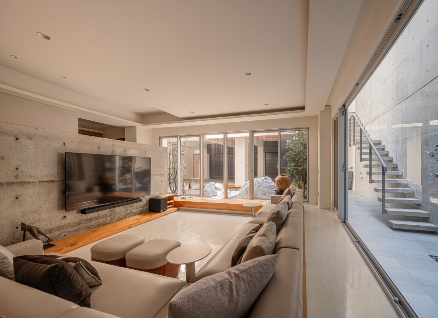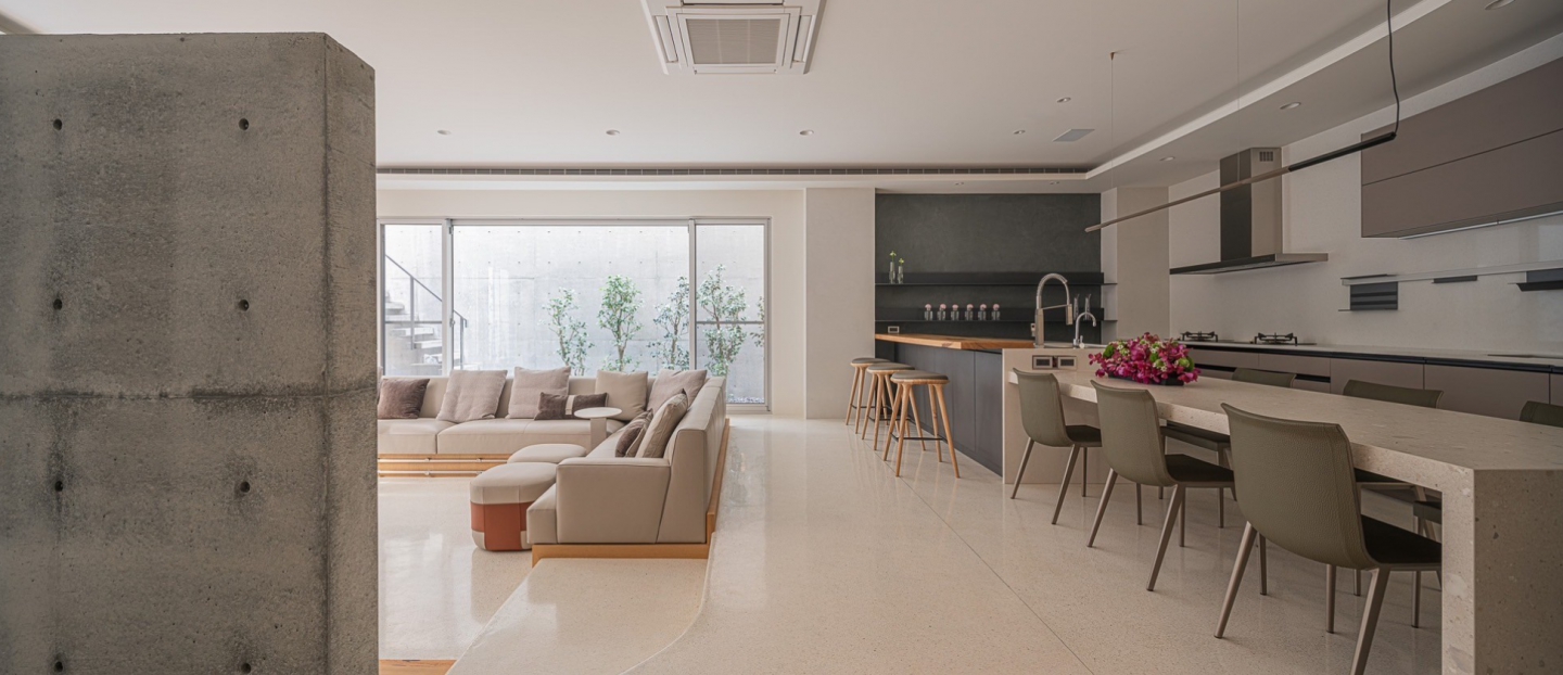 後棟1樓為客餐廳,客廳區地⾯降板設計,是為了讓廚房可直視⼾外不被沙發所阻擋讓空間更通透, 與室外景觀結合,視野更為遼闊。