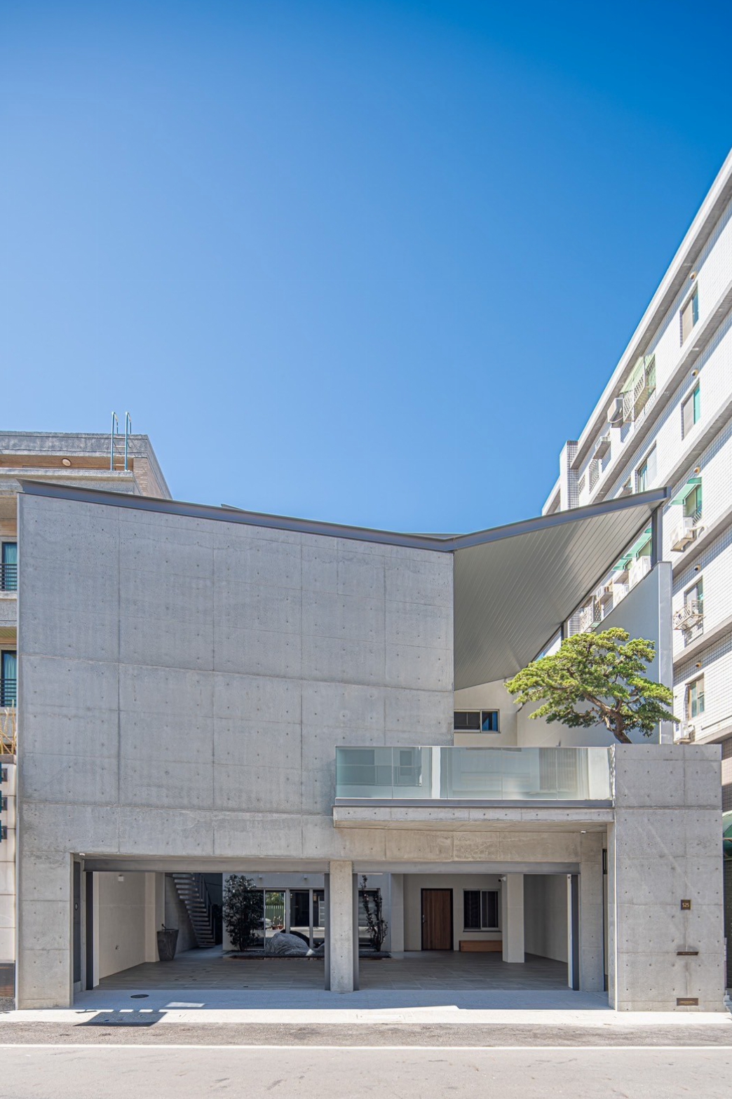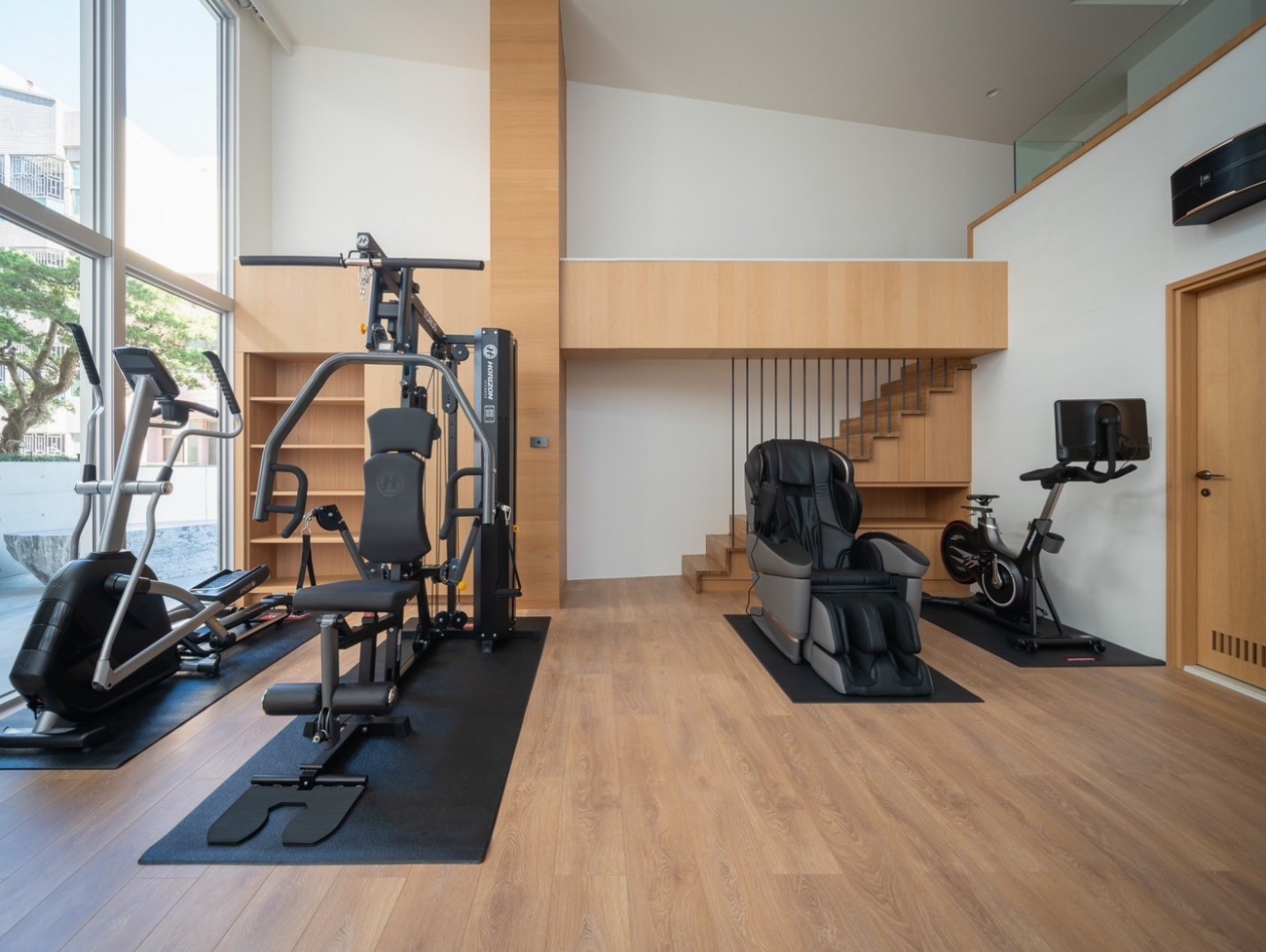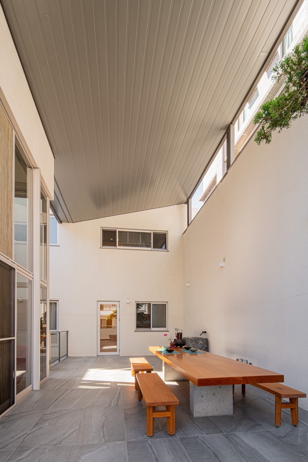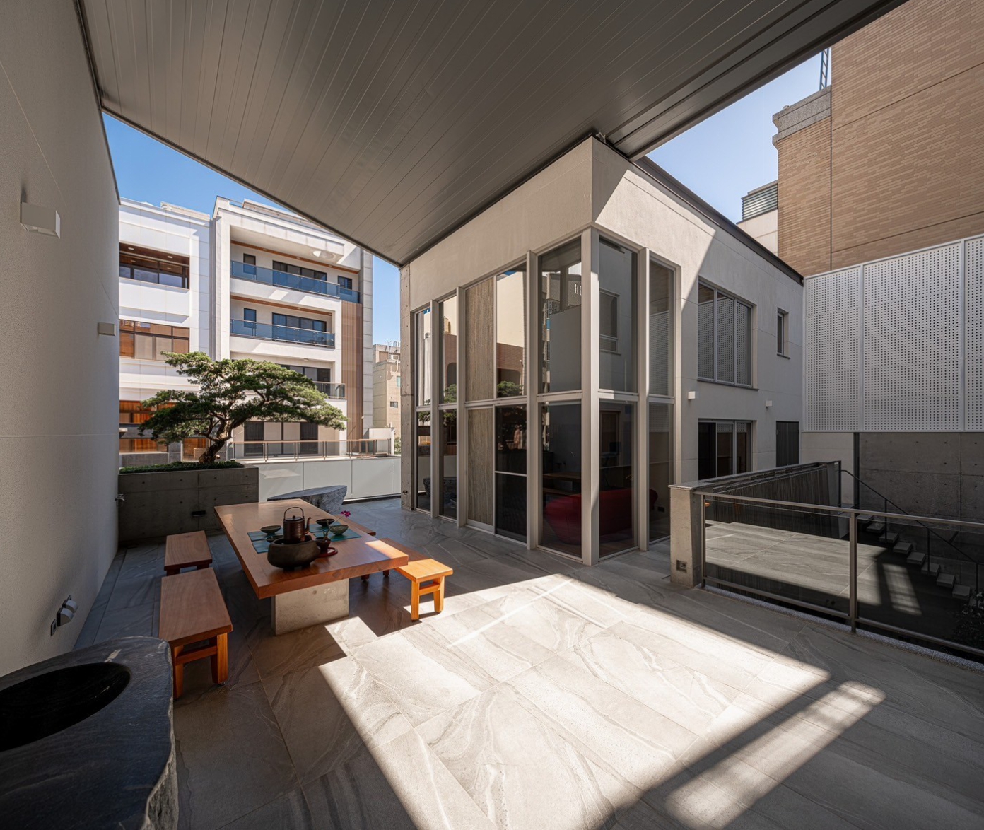 1F清⽔模室外梯可通往2F的⼤露台,是宜動宜靜、雅俗共賞的空間,採⽤台灣天然溪⽯切磨製成平台⽔槽,⽅便此區餐食茶飲所需,與實⽊長桌及針柏、⽯椅相映成趣,連接前棟健⾝房,此區兼具唱歌、運動、上網閲讀等功能⋯夾層可休憩下⽅設有浴室,於運動後汗流浹背時可沖洗換裝,整體為休閒、娛樂兼容的場域。