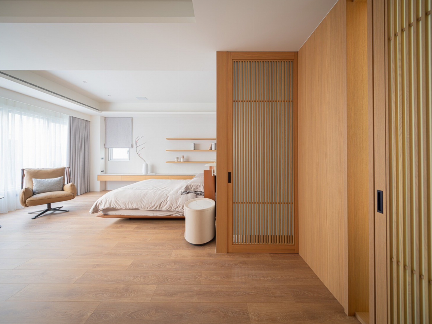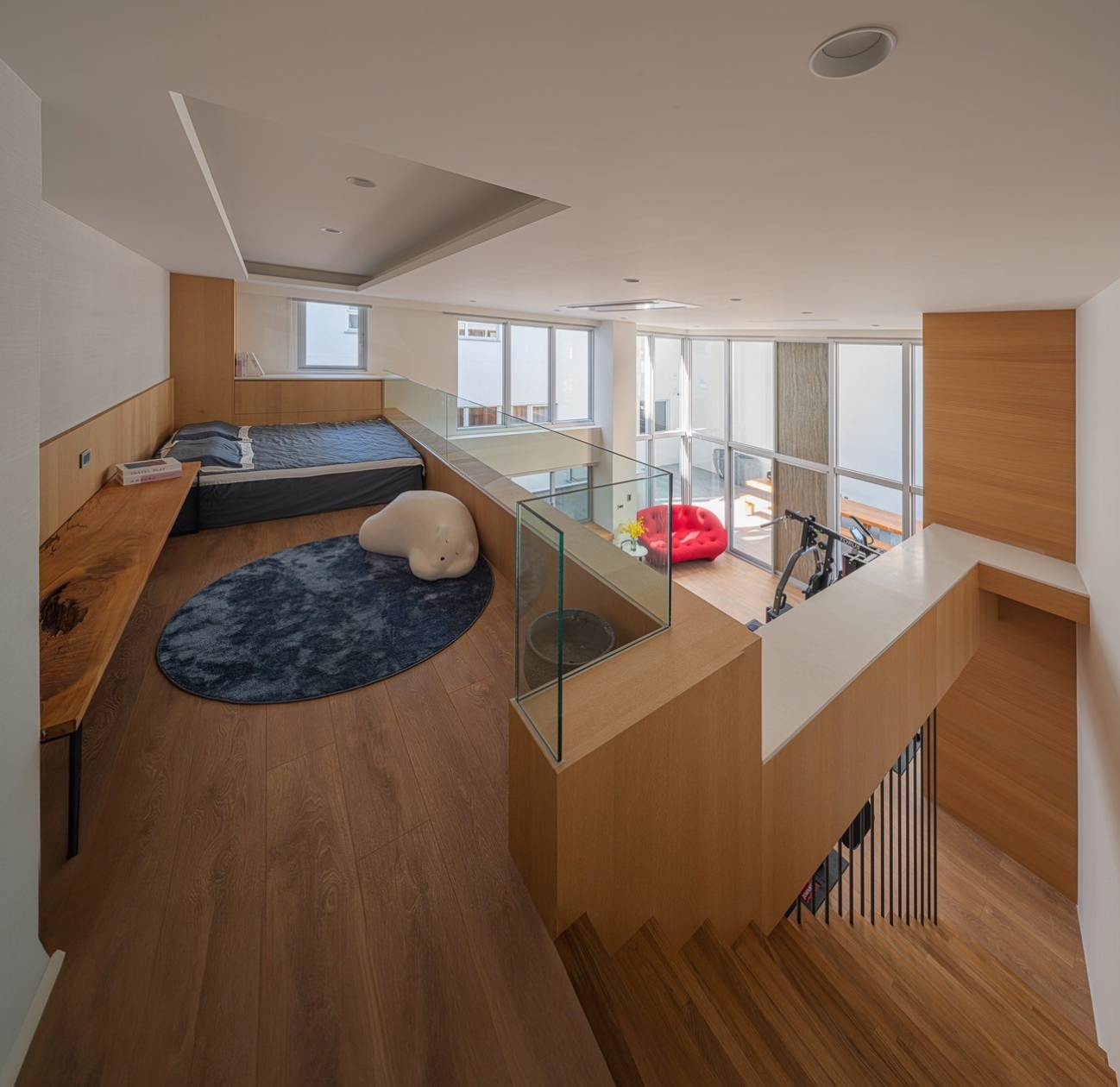 2、3樓為私領域臥室空間,提供滿⾜家⼈個別需求的功能設計,具有充⾜的採光及通風,室外圍牆採取⾦屬洞洞板,局部開孔設計可以欣賞陽光照射所產⽣不同的光影變化,亦保有絶對的隱私。