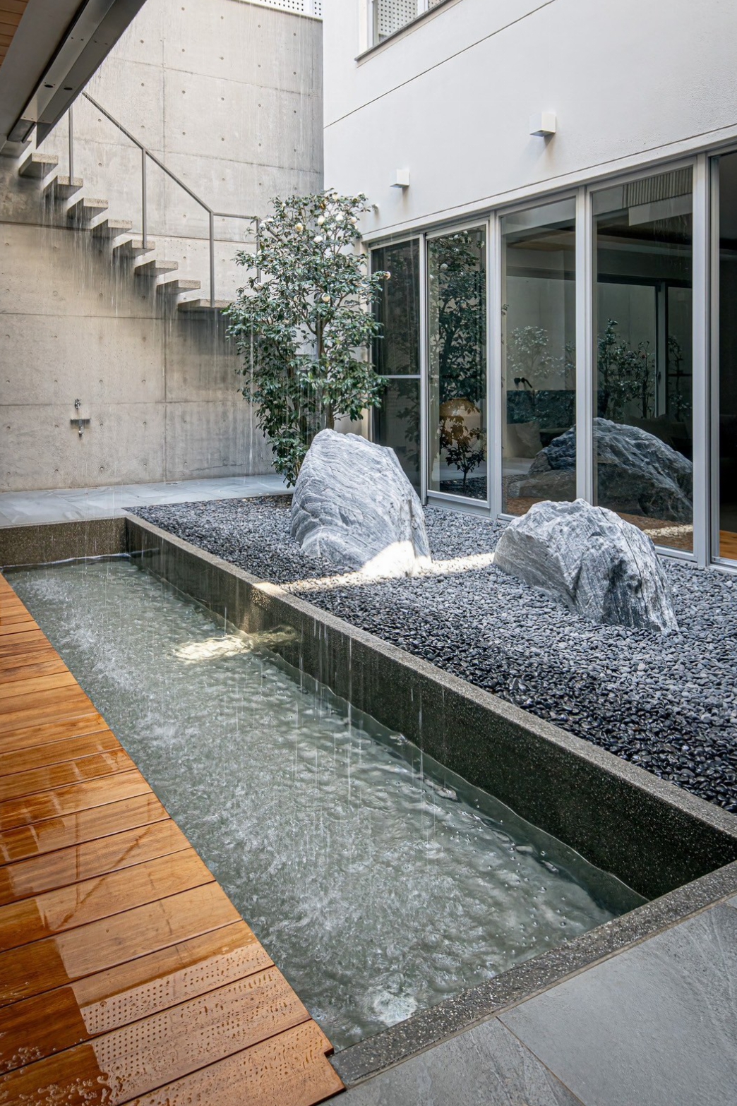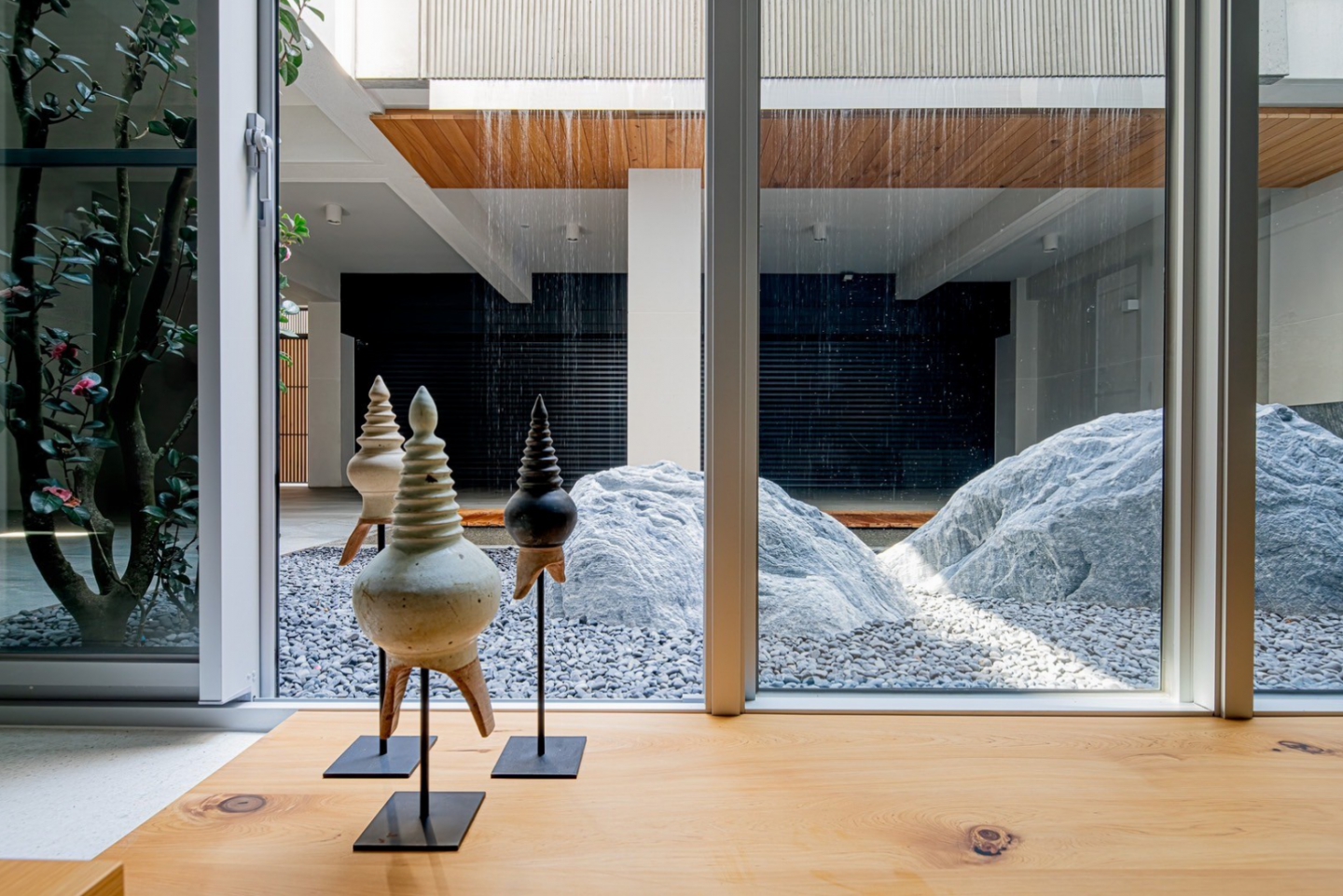 將屋主所精⼼培植的⼭茶花設置於1F⼾外走道及挑空天井處,⼭茶花冰清⽟潔,其睥睨嚴寒的傲 骨,也讓⼈感受到其深沉的美,⽔池邊之景⽯更增添其獨秀安逸的氣息。