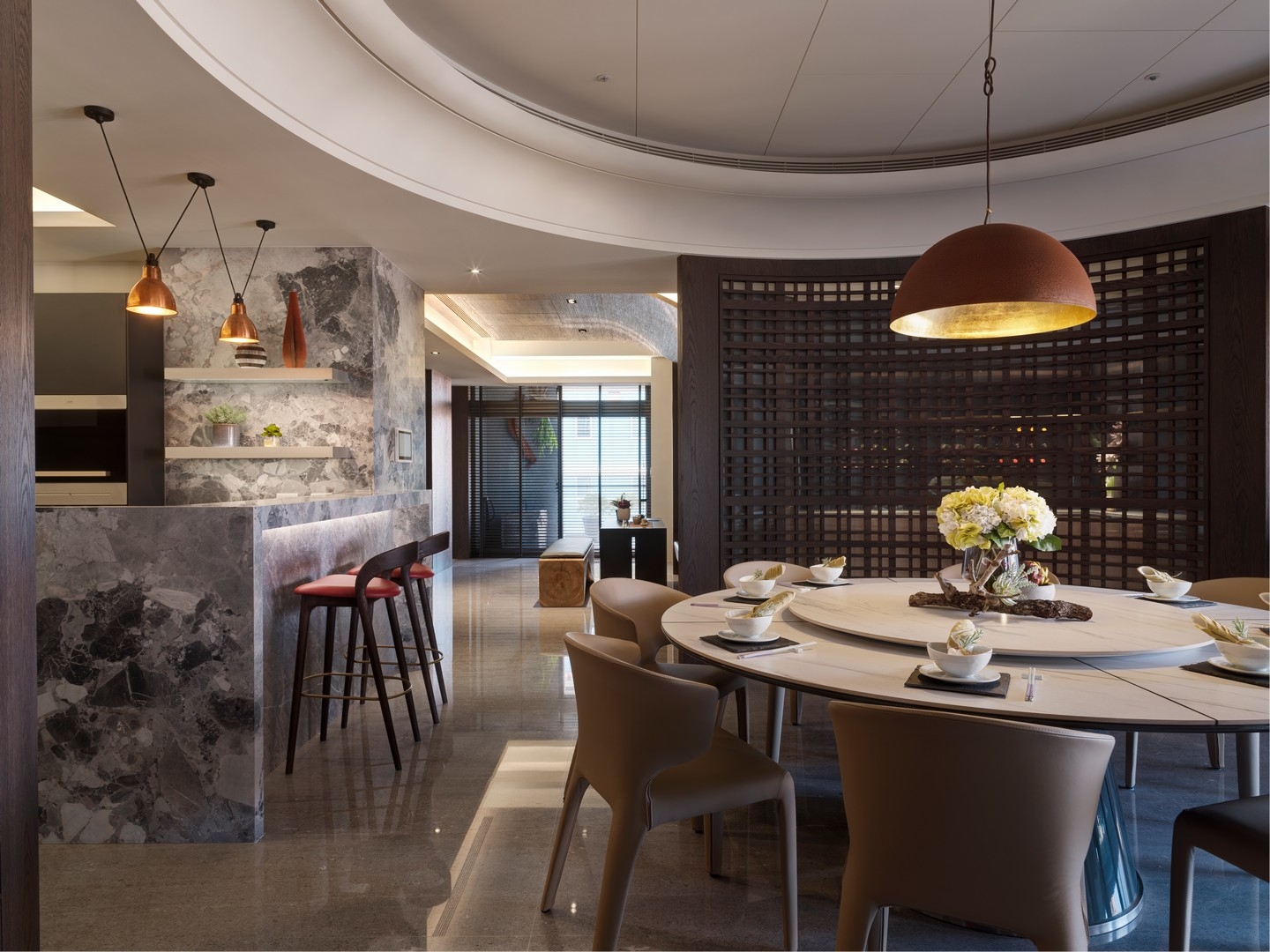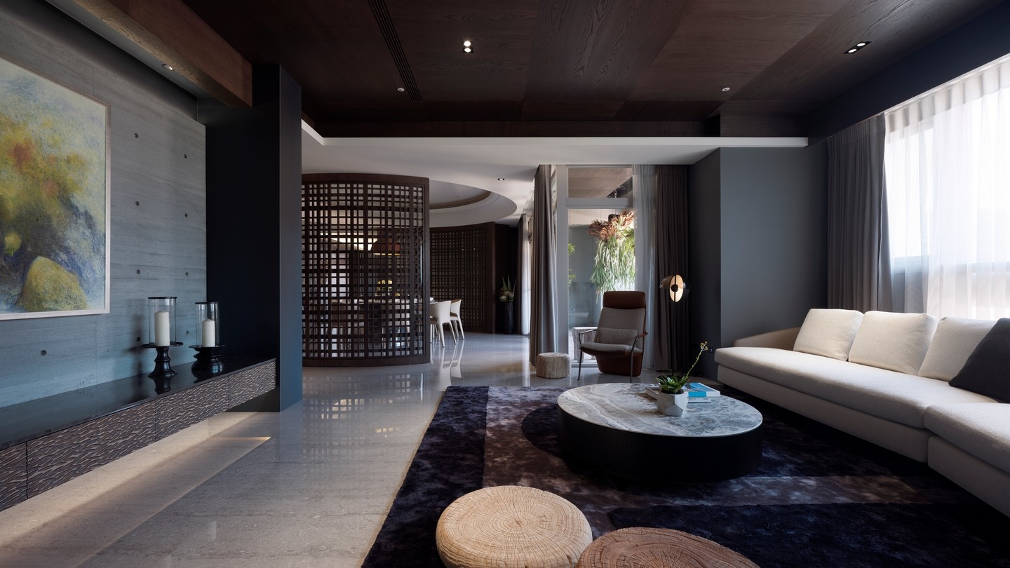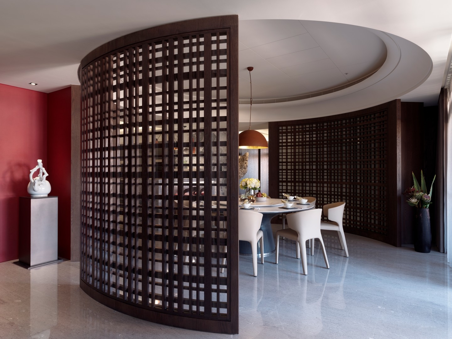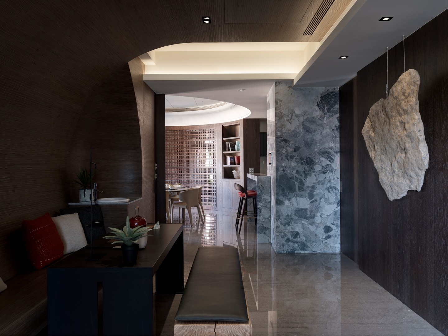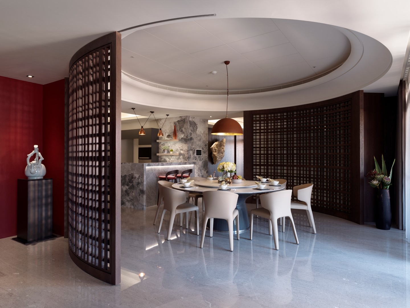 用其源自東方的隱喻藝術及西方極簡的語彙,將方圓的元素運用於室內空間,在極簡的方形框架中加入了圓形的線條,使用垂直、水平方向的木條組合,虛實交錯產生視覺的層次感,用滑動的圓弧隔屏來斷開玄關、餐廳與客廳的區域,餐廳與儲酒室因裝設了特殊玻璃裝置,可選擇透明模式,則視覺可以穿透讓餐廳更顯寬廣,若維持霧面模式則此空間就可純粹做為堆放物品的儲藏室。。