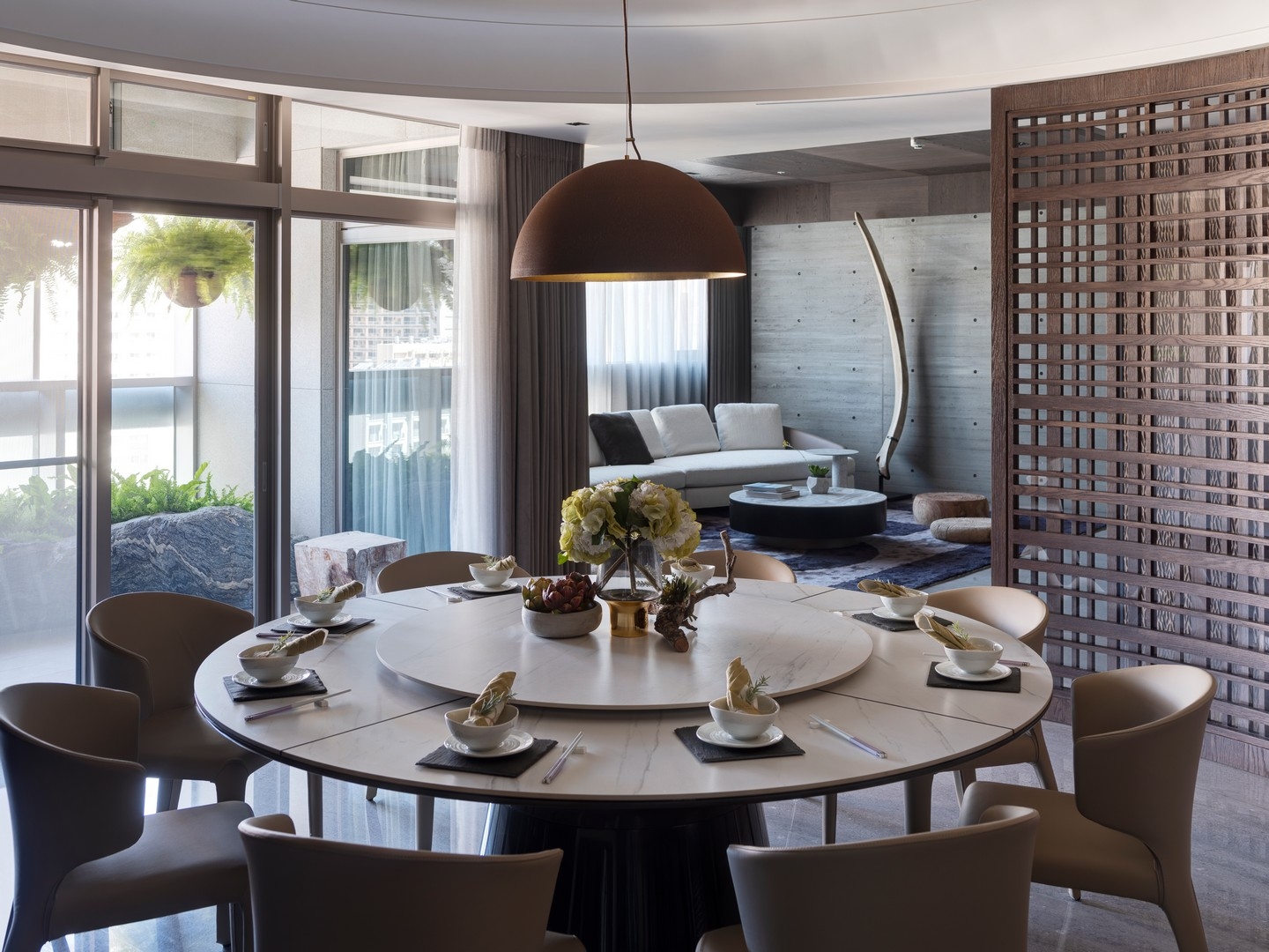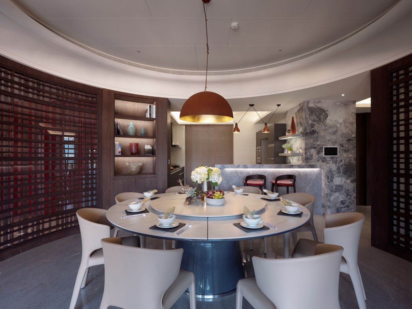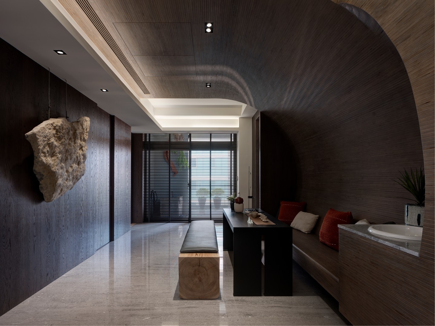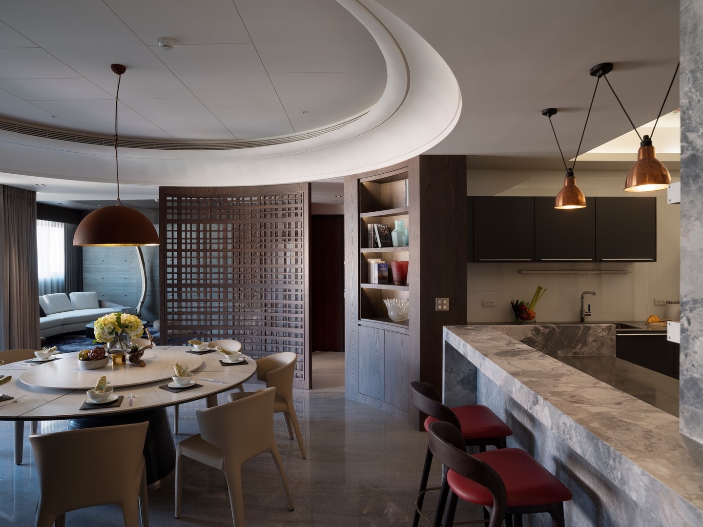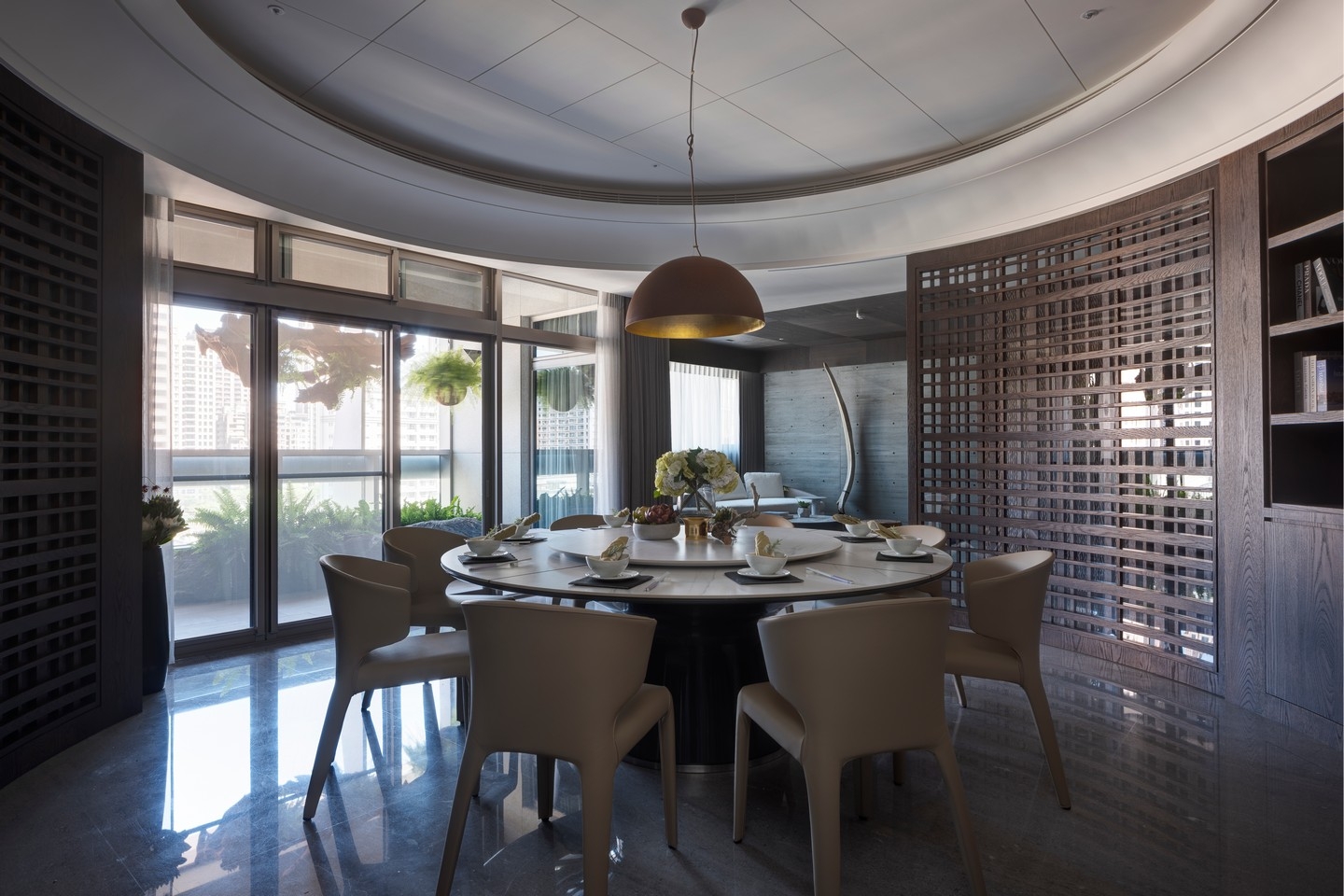 用其源自東方的隱喻藝術及西方極簡的語彙,將方圓的元素運用於室內空間,在極簡的方形框架中加入了圓形的線條,使用垂直、水平方向的木條組合,虛實交錯產生視覺的層次感,用滑動的圓弧隔屏來斷開玄關、餐廳與客廳的區域,餐廳與儲酒室因裝設了特殊玻璃裝置,可選擇透明模式,則視覺可以穿透讓餐廳更顯寬廣,若維持霧面模式則此空間就可純粹做為堆放物品的儲藏室。。