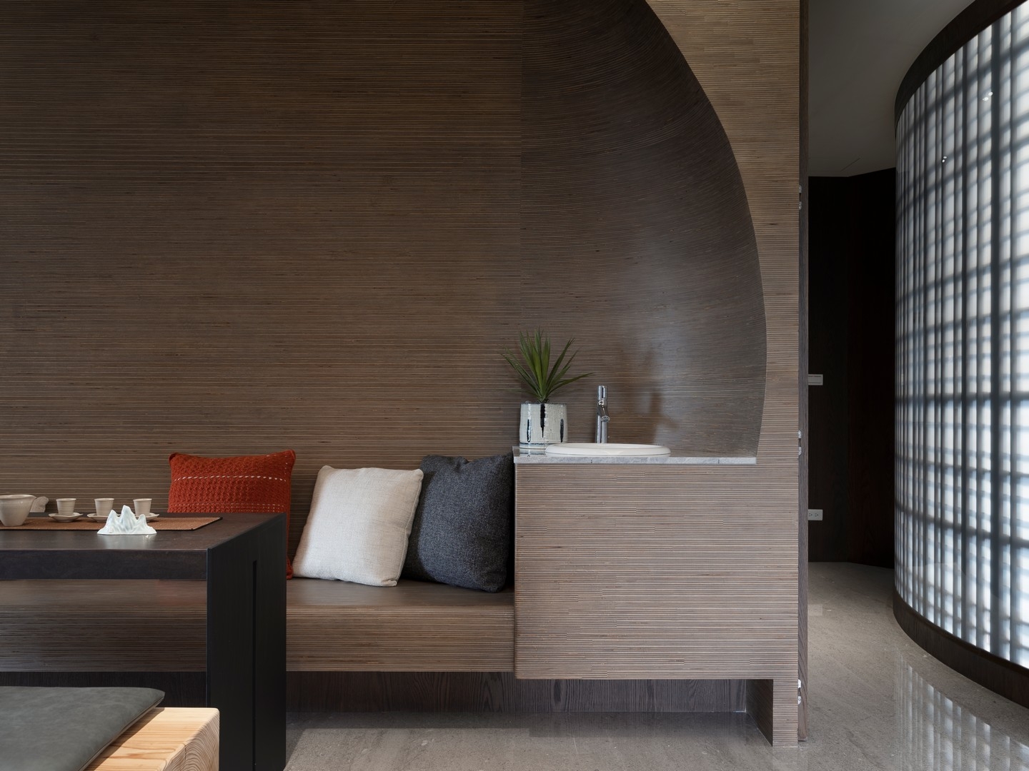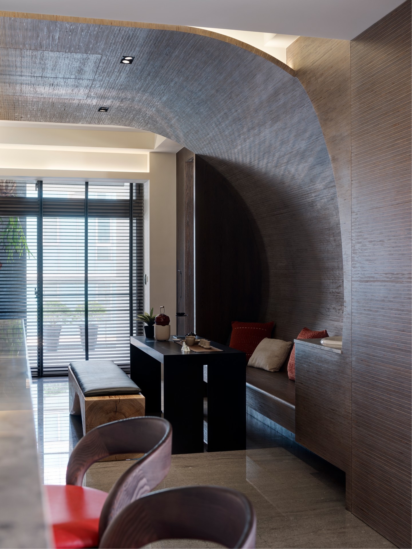在公領域空間,利用3間臥室外的走道區域,以夾板堆疊成弧形,彎曲座椅和壁面延續至天花板,除了實用之外也增添了些許的趣味性,設置了洗手槽方便在此泡茶喝咖啡度過下午茶的悠閒時刻;而旁邊小門內設置了可調式層板,可當儲酒室,亦可做為儲藏室,若啓動切換開關則從餐廳可以透視此區,營造出別有洞天的新鮮感,所以除了泡茶談心之外,轉換成品酒閲讀的小天地亦是不錯的選擇。
