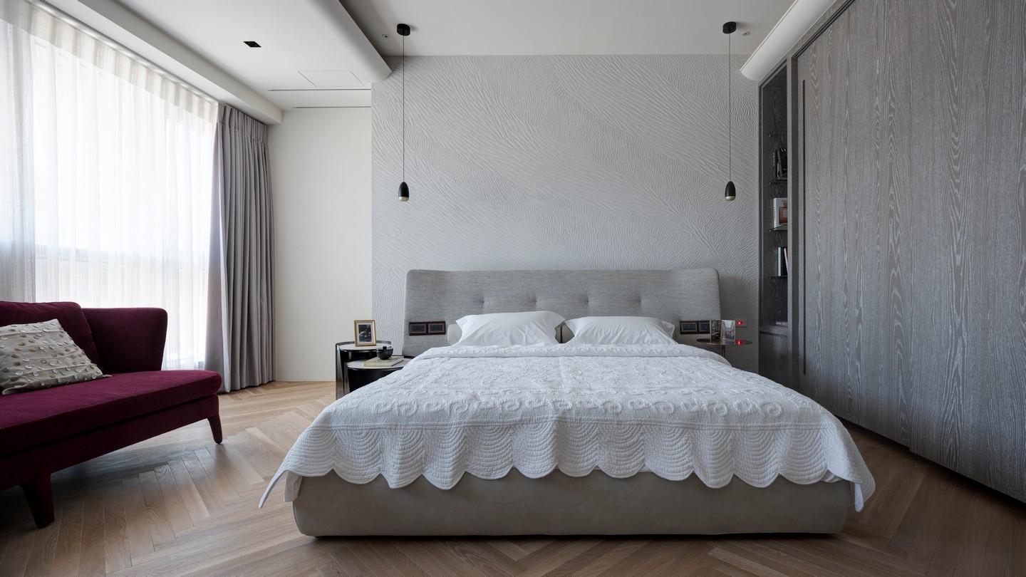 主臥室的主牆作法是塗抹日本的白洲土,它除了具備除濕除臭的功能之外,利用它的可塑性用抹刀做出如油畫般的筆觸,床頭後的空間利用死角設置了有電鎖的珠寶櫃,地板鋪設橡木實木,櫥櫃則採用橡木染色呈現溫潤的質感,其他兩間臥室則採用不同風格色彩來展現不同個性的居住空間。