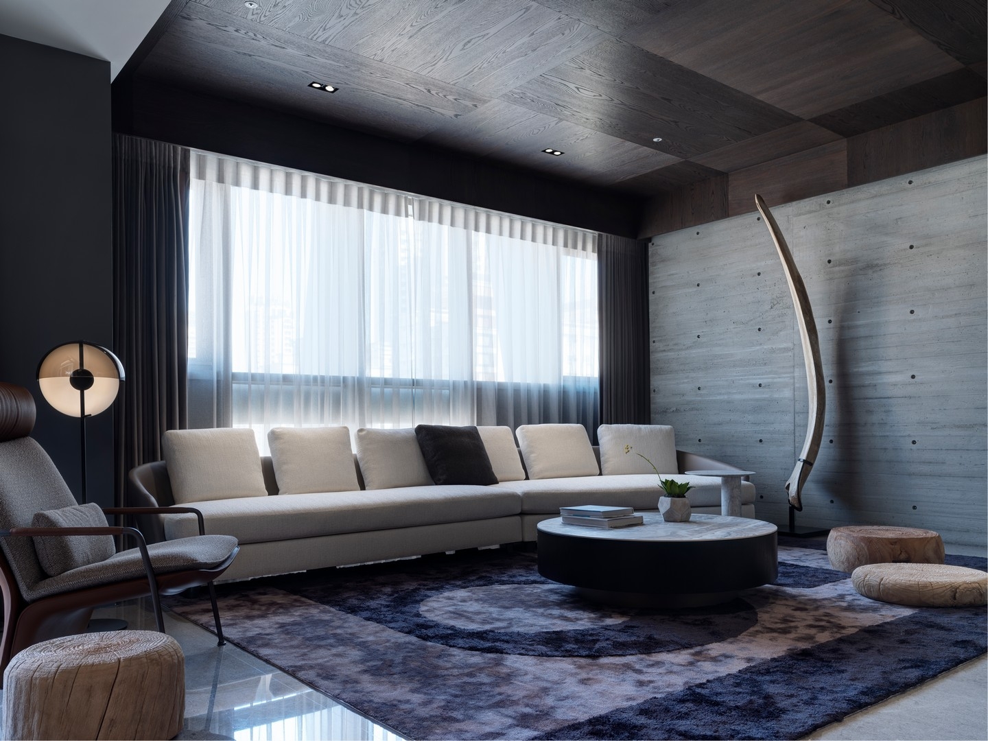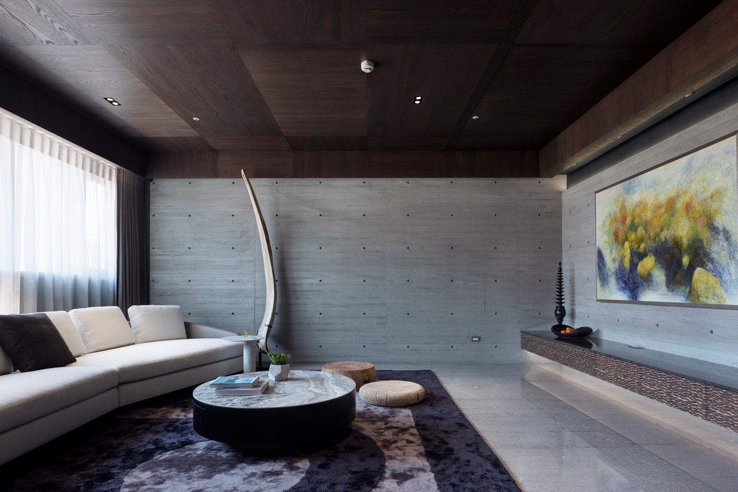 客廳牆壁是現場架設模板以混凝土用手工澆注而成清水木紋模,搭配白色簡約造型的義大利minotti沙發更顯雅緻,櫃面採用雕刻實木和鐵板組合,玄關壁面裱貼東方红皮革,讓時尚與質樸、東西方的元素相互交融,展現兼容並蓄的獨特品味。